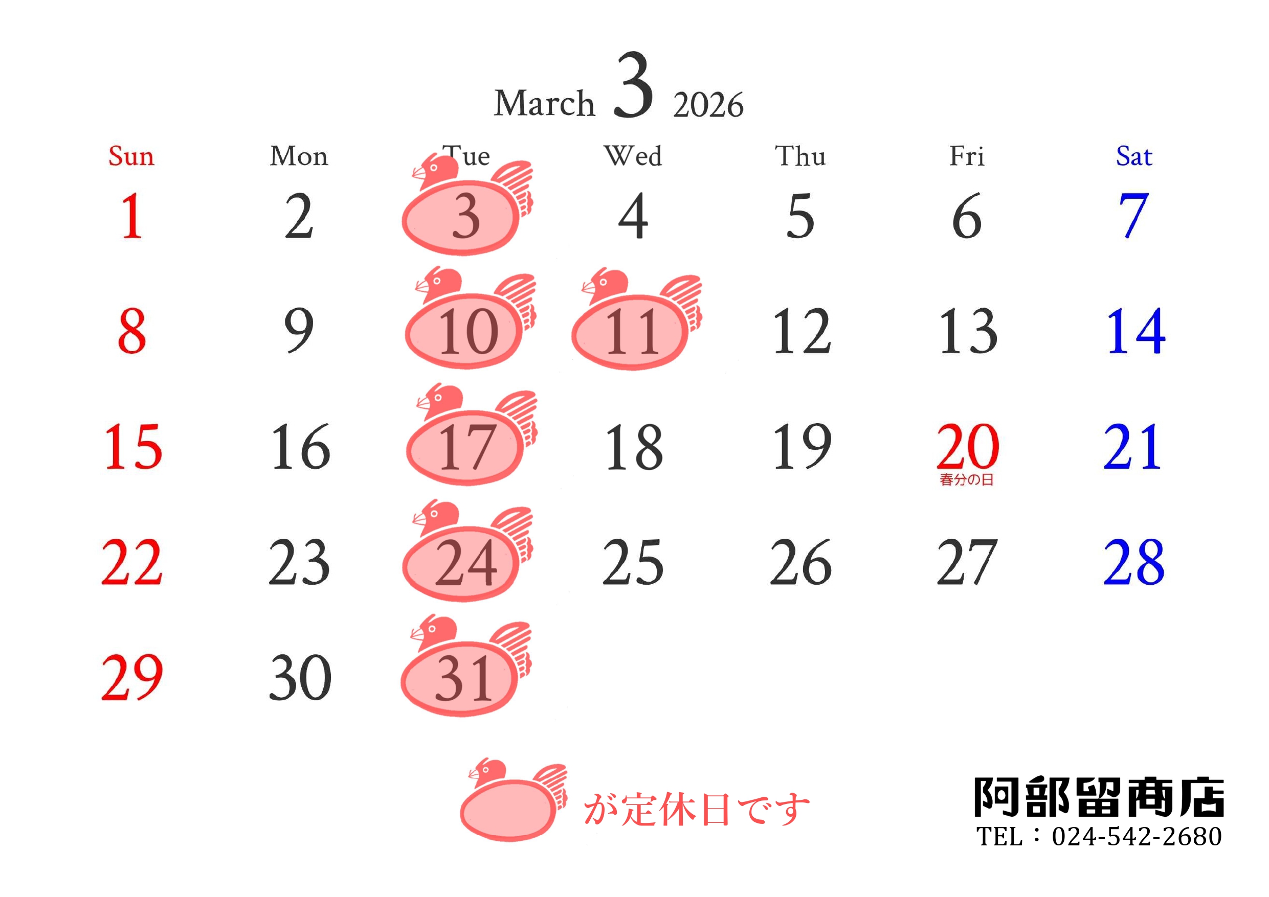 2026.02.15 3月の定休日のお知らせ 毎度ありがとうございます。 3月の定休日のお知らせです。 雪も少なく、とても過ごしやすい日々が続いるこの頃の飯坂温泉です。 3月も皆様のご来店を心よりお待ちしております。
