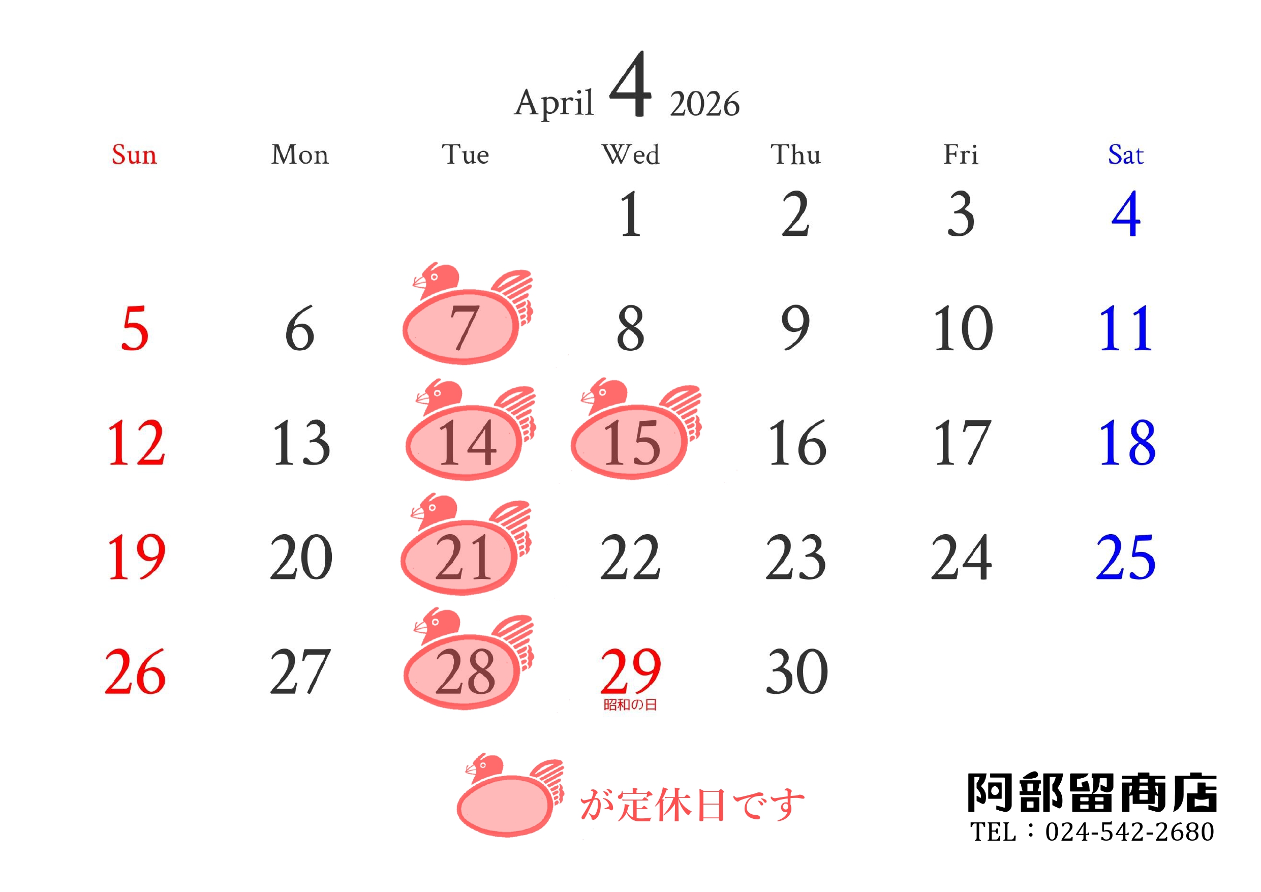 2026.03.15 4月の定休日のお知らせ 毎度ありがとうございます。 4月の定休日のお知らせです。 あたたかい陽気も増えはじめ、春の訪れがもう間もなくな今日この頃の飯坂温泉でございます。 4月も皆様のご来店を心よりお待ちしております。