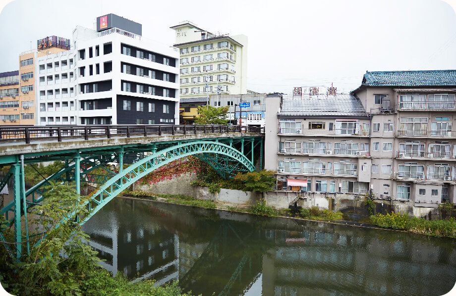 当店の近くを流れる摺上川(すりかみがわ)にかかる、飯坂温泉のシンボル「十綱橋(とつなばし)」。